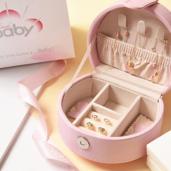 صُمم هذا الصندوق الفاخر للمجوهرات بأناقة وصنع ليكمل مجموعة Baby Jewels الخاصة بك، وهو هديتنا لك على الطلبات التي تزيد عن 1500 درهم إماراتي. بفضل تصميمه الأنيق وحجراته الفسيحة، فهو المنزل المثالي لقطعك الثمينة.